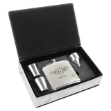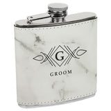 Customize our white marble leatherette flask gift set with engraving on both the box and on the flask.